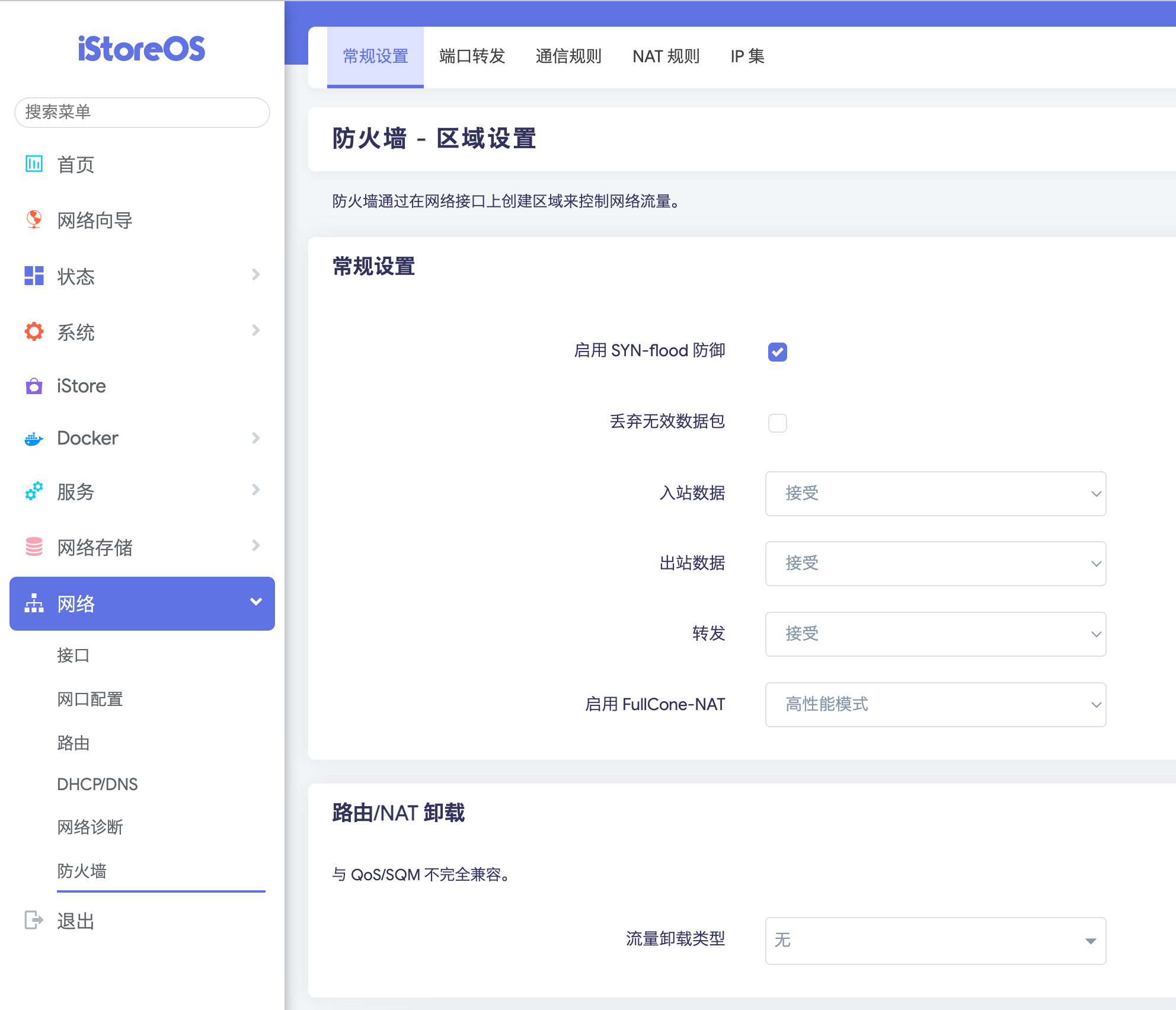 进入 网络–防火墙,进入到防火墙设置页面。常规设置里,入站数据,出站数据,转发这三个选项都选择接受。