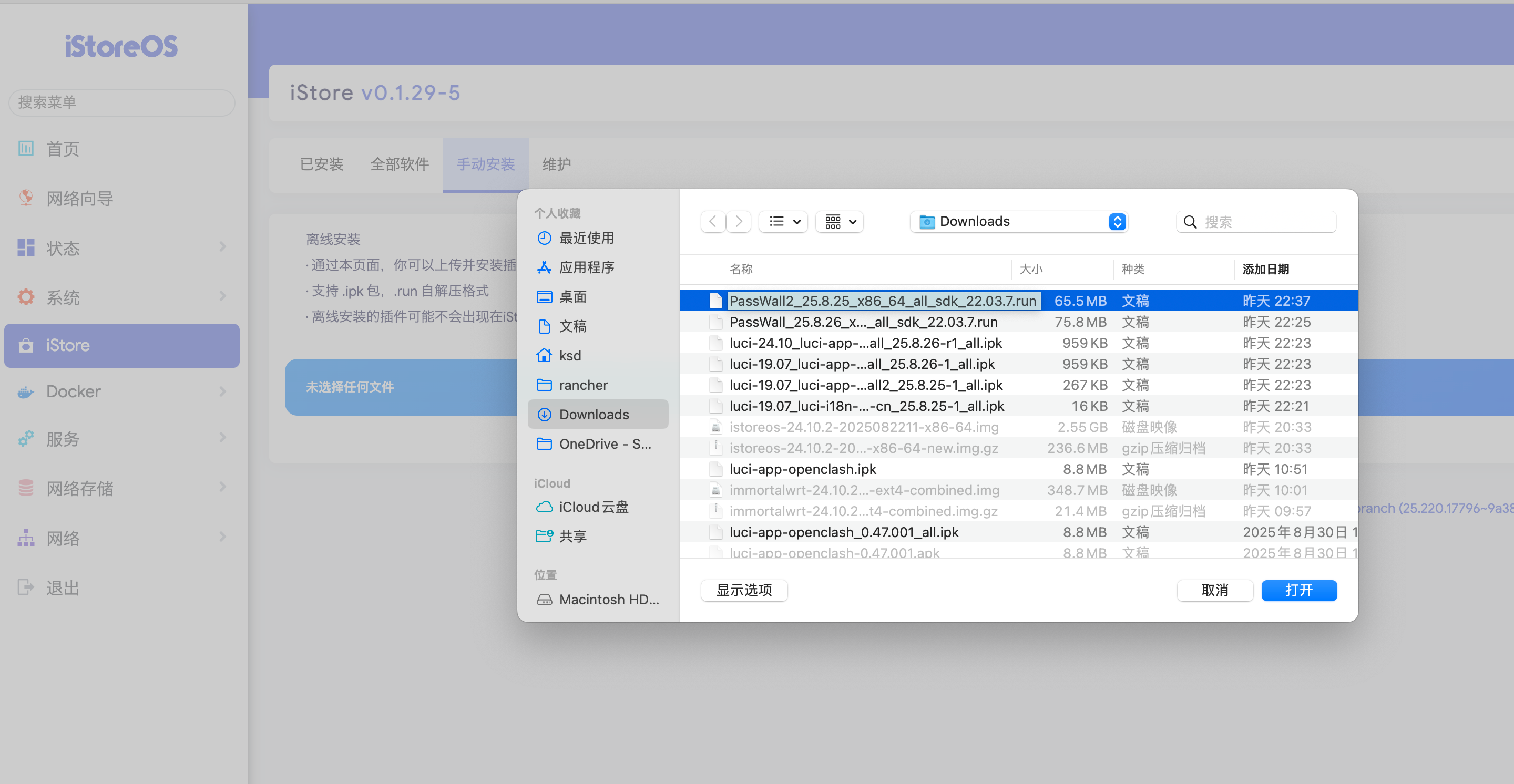 下载之后是一个 run 后缀的安装包,可以在 iStore–手动安装,通过上传安装包去安装: