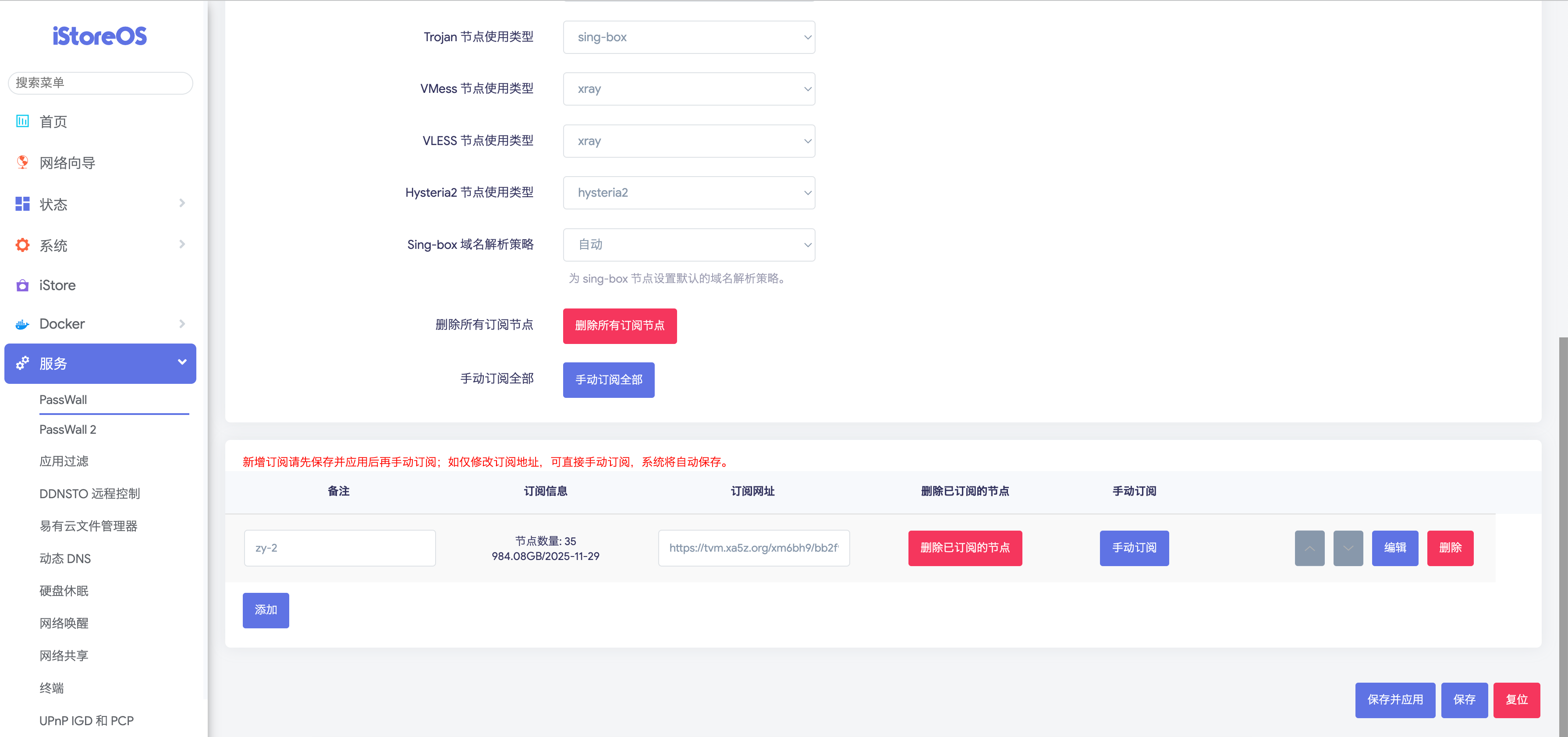 在 节点订阅最下面添加你的订阅地址,并保存应用: